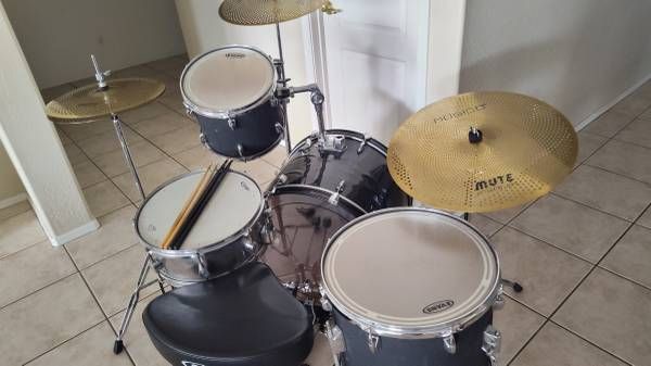 Pacific drum set 4 drums 22 bass 16 floor tom 12 rack tom 14 snare Low volume 14 high hats 16 crash 18 crash ride PDP high hat pedalkick pedalthr 1 cymbal stands Skins were removed from the floor and rack tom then painted black Plays and sounds good Good beginners or garage kit Text or call 623-203-6152 can meet at the Quick Trip on 67 th Ave and Happy Valley Rd Cash Pacific drums and Percussion