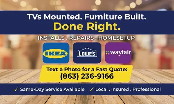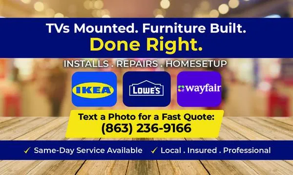 Task-Smart Handyman Services provides reliable help for home repairs, installations, and urgent issues. Emergency availability: Available 24/7 through the holidays for time-sensitive needs such as: • Active leaksfaucets, supply lines, toilets • Loose/unsafe fixturesfans, shelves, mounts • Doors that won’t latch/lock, broken hardware • Quick removal/hauling when items must be moved immediately Common services: • TV mounting / shelves / curtain rods • Ceiling fans & light fixturesswap/install when wiring is ready • Furniture assemblybeds, dressers, flat-pack • Door hardware, locks, handles, weather stripping • Drywall patching, minor trim repairs • Basic plumbing helpfaucets, toilets, clogs—non-emergency • Haul-away / furniture removalpickup + disposal Clear pricingno surprises: • Most jobs are flat-rate based on photos and details. • After-hours/emergency work is quoted clearly before dispatch. • If scope is uncertain, a not-to-exceed price is provided before work begins. To get a fast quote, send: Photos of the issue/area Address/area What you need d 1 + urgency Whether parts/materials are on site Service area: Davenport • Haines City • 4 Corners • Poinciana • Kissimmee • Lakelandand nearby Call/Text:863-236-9166 Website: Task-Smart.com