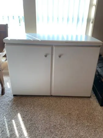 Sewing machine desk/cabinet, approximate replacement cost $2,000 when closed 43.5 wideX 23 deepX 31 highfor large sewing machine with adjustable 50 lb. lift$250 on Amazonhas casters, storage bins on inside of doors. Compare to Arrow or Kangaroo sewing desks/cabinets. Extensions on sides: left 26 x 20, right 15.75 x 20 and back extension 42 x 20. Sewing machine not included. $350 CASH only…REDUCED TO $275 CASH! If listed it is still available. Text 469-834-9201
