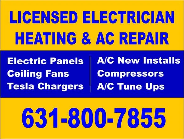 I have 15 Years of Electrician and HVAC Heating & Air Conditioning Technician experience. I am licensed and insured and can trouble shoot and fix any type of problem you may be having in your home or office. I am h 1 st and affordable and can usually do SAME DAY SERVICE CALLS! I do not carry the overhead of a lot of these electricians and HVAC companies, so I can typically save you 20 to 50 on whatever type of work you need d 1. Call me at 631-800-7855 Electrician Work I do 220 Installs Ceiling Fan installs Recessed Lighting Security Lights Tesla Chargers Electric Vehicle Chargers EV Chargers Car Chargers GFCI Installs Hot water heater hookups Outlets Switches Plugs And everything else electrical Call me at 631-800-7855 Heating & Air Conditioning Work I do AC Repair A/C Repairs Air Conditi 1 r Heating Furnace Repair Heat Pump Services Geothermal Heat Pump Installation Boiler Repair Carbon Monoxide Testing Blue Track by Thermo King Tractor Trailer / Box Truck Carrier Chiller Repair Humidifiers Dehumidifiers Air Filtration Air Cleaners Gas Fireplaces Duct Cleaning Ductless Mini-Split Systems Oil to Gas Conversions Aeroseal Duct Sealing Home Energy Audits HVAC Replacement HVAC Repair HVAC Maintenance Fan Coils & Air Handlers and everything else heating & air conditioning related Call me at 631-800-7855 Call me and you can rest assure that Ive probably seen your problem and fixed it many times before. Call me today at 631-800-7855 . . . . . . . . Keywords: Electric Electrican Electricians Electricans elctrician elctricians eletrician elecrtician eletrician electrial electrian Electricista elecctrician Electrcian