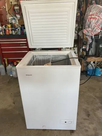 Hotpoint 4.9-cu ft Manual Defrost Chest FreezerWhite This Hotpoint Freezer works perfectly. In my garage. Looking to downsize and no longer need the extra freezer storage. Easy-access defrost drain - front drain makes defrosting quick and effortless. Removable basket - compartmentalize and organize food storage. Please contact Mike for questions, 814-933-9066