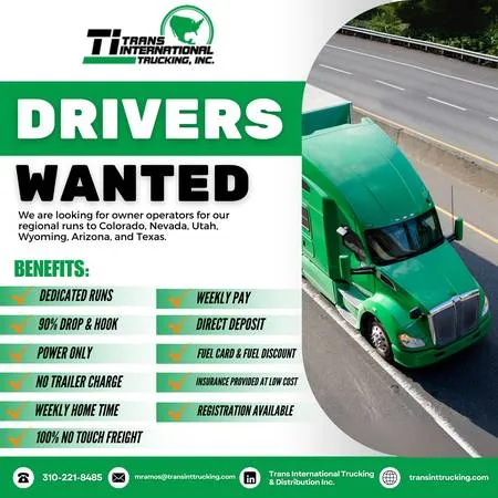 Started in 1991, Trans International is a national motor carrier headquartered in Los Angeles, California. We foster a driver first mentality and are looking for drivers that want to grow with us for years to come. We offer local, regional, and national OTR routes. For our drivers, our goal is to keep you moving with at least 3,000 weekly miles. If you are looking to sign on with a trusted, dependable, and reliable carrier, Trans International is for you. We have regional runs to Colorado, Nevada, Utah, Wyoming, Texas and Arizona These are dedicated runs, plenty of miles available. OUT and BACK! !!POWER ONLY!! Benefits for Joining Our Team * Dedicated Runs * 90 Drop and Hook * Power Only * No Trailer charge * Weekly Home Time * 100 No Touch Fr 8 * Weekly Pay * Direct Deposit * Fuel Card and Fuel Discount * Insurance Provided at low cost * Registration Available Minimum Requirements: - 2 years Class A License - Current Clean DMV Printout If you are interested, you may apply or call using the following: https://intelliapp.driverapponline.com/c/transinttrucking?uri_b=ia_transinttrucking 176-131-5443 Call Mario 310-221-8485 or Call Danny 310-241-4176