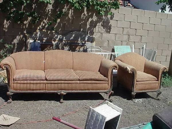 vintage couch and chair carving on legs and trim on bottom front good condition 1 leg of chair broken and missing pieces back of chair has cat scratches on both corners couch 811/2 inches long 34 inches tall 32 inches wide 18 inches seat h 8 chair 36 inches wide 34 inches tall 32 inches long 18 inches seat h 8 $75.00 for the set of 2 call 951-926-6087