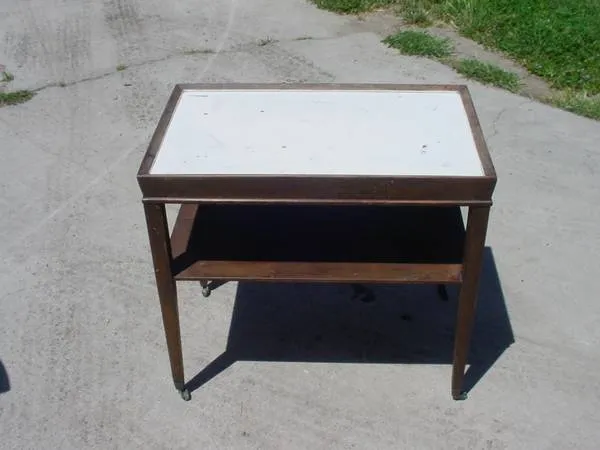 vintage rolling end table on metal casters good condition top has been painted white table 25 inches long 251/4 inches tall 151/4 inches wide $25.00 call 951-926-6087