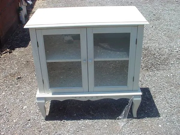 white cabinet 2 doors wood framed glass doors 1 shelf looks like crackle paint good condition cabinet 30 inches long 30 inches tall 16 inches wide $40.00 call 951-926-6087