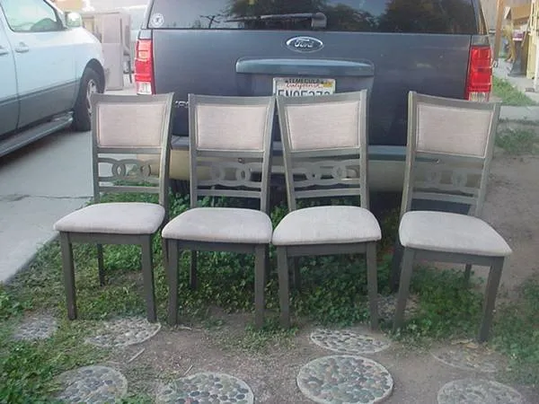 4 chairs vinyl upholstery chairs have covers on each chair good condition chair 38 inches tall 19 inches wide seat h 818 inch $40.00 for the set of 4 call 951-926-6087