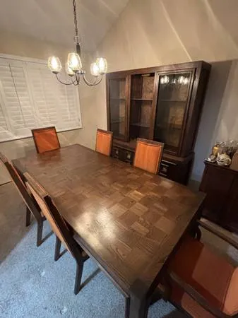 Nice Thomasville dining room set in near new condition. Not a single Scratch or imperfection on the table or China cabinet and the table comes with a pad and extra leaf to make Dining for up to 12 people possible, comes with 8 chairs. China cabinet has recessed lighting and looks very nice. Lots of woodgrain texture and also in new condition.. Cost over $10,0005 or 6 years ago, but now we just needed out of the house. 408-603-8063 Pottery barn basset luxury solid wood formal d...