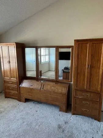 Thomasville premium real hardwood bedroom set. Cost over $5 k and still in great condition. Comes with mirror and over head piece with lighting. Has lots of storage for him and her or whatever. Very nice and functional high end furniture for a great deal. Make any bedroom look nice. $240 /obo 408-603-8063 Outstanding Craftsmanship by Thomasville . Dimensions: 911 W x 78 H x 19 D