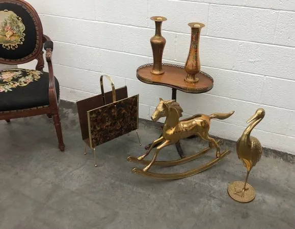 *No email please. Mid Century Brass Decor; Large brass rocking horse, $40.00 Brass Crane figure, $20.00 MCM organizer, $30.002 fancy brass cylinders, $30.00 both Replogle Globes, $20.00 each. George 928-776-1968