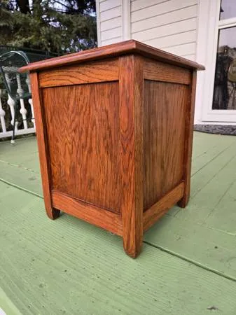 Vintage storage stool made in solid oak. Features lift top lid and measures 17 T by 14 Sq and is in good vintage condition. Cash only $95 text 612-584-3614