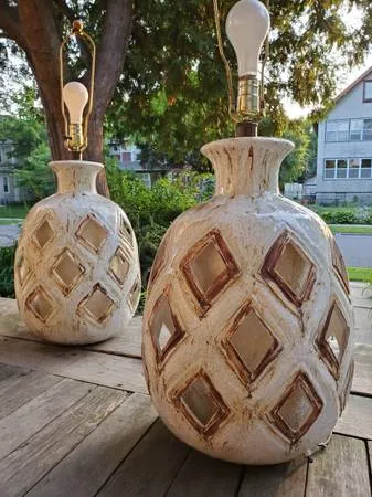 Pair of vintage brutalist stylized pineapple lamps made mid century with pierced drip glaze ceramic bases featuring inner diffusers. Each measures 32 to top of harp, work fine and are in good vintage condition. No shades included Cash only $300 text 612-584-3614