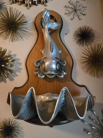 Vintage cast aluminum lavabo from the studio of Bruce Fox ca 1950 s. Mounted on a hardwood plaque it measures 33 T by 23 W and is in good vintage condition. Cash only $650 text 612-584-3614