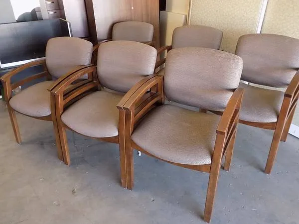 Combined Source Office Furniture New and Used 602-263-8855 or Best 602-391-8884 call/text 37 available. Used matching client, side, guest chair and/or lobby reception seating. Solid wood espresso finish frame, tan/brown fabric seat and back. O.C.I. American Made solid very high end and heavy duty construction wood frame. Very commercial grade . Solid well built quality heavy duty chair all in excellent condition. New they are $695.00 each $98.00 each Can be seen at our mid town Phoenix store location, contact Al on cell 602-391-8884 to set a time to check out these items, again call to set a time as we are in and out during the day--also can do evenings and weekends for your convince also have an extensive inventory of many other office furniture to see, apprx. area 3 rd street and Osborn Combined Source Office Furniture New and Used 602-263-8855 or 602-391-8884 We accept Visa, Master Card, American Express, and of course cash Delivery and installation is available combined source new and used office furniture lobby reception side guest client waiting room meeting chair chairs seating brown tan beige designer pattern fabric real solid wood espresso brown finish heavy duty durable Hon OCI Global Steel case herman miller haworth Solid heavy duty