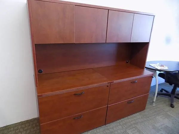 Combined Source Office Furniture New and Used 602-263-8855 or 602-391-8884 CHERRY MAN Cherry Cognac finish 4 drawer lateral file credenza with storage hutch 2 sets available 1 set left $399.00 credenza cabinet Can be seen at my location contact Al on cell 602-391-8884 to set a time as we are in and out during the day. also have an extensive inventory of many other office furniture to see, apprx. area 3 rd street and Osborn Combined Source Office Furniture New and Used 602-263-8855 or 602-391-8884 We accept Visa, Master Card, American Express, and of course cash Delivery and installation is available combined source new and used office furniture storage door cabinet filing heavy duty industrial grade adjustable shelf lateral file letter / legal cherry wood laminate Cherryman credenza server printer stand file unit