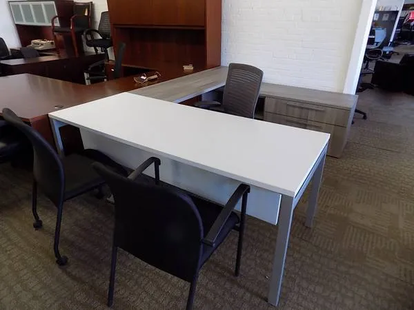 Combined Source Office Furniture New and Used 602-263-8855 or Best 602-391-8884 call/text LAST 1 Have a total of 5 U style table desks left or right 6 x 86 with storage bookcase lateral drawer unit. Part of a larger buy with many other matching items including L shape desks - $599.00 eachtotal of 5 All L shape are Sold $799.00 Last 1 This item can be viewed, but Call to set a time to be seen at my warehouse also call for our mid-town Phx. location, contact Al on cell 602-391-8884 to set a time to see this item, again call we are always open but not always here as we are in and out during the day--evenings and weekends are also available with extended notice. Have an extensive inventory of many other new and used office furniture to see, apprx. area 3 rd street and Osborn Combined Source Office Furniture New and Used 602-263-8855 or 602-391-8884 We accept Visa, Master Card, American Express, and of course cash Delivery and installation is available combined source new and used office furniture dark wood laminate U corner desk with extension bridge arm mid size work desk station Grey designer white small mid size open table desk very high end