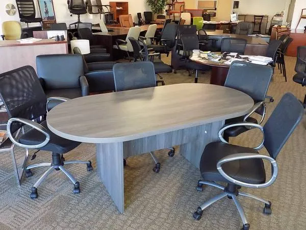 Combined Source Office Furniture New and Used 602-263-8855 or Best 602-391-8884 call/text Package Price $869.00 6 racetrack Grey conference table and 4 matching chairs separate table $389.00 and chairs are $219.00 each Lot $869.00 Also available 8, 10 sizes on the table see below and available in 5 finishes. Espresso, mahogany, Dark Cherry, Light Winter walnut, and Artisan Grey Race Track Conference meeting room 8 foot $519.00 6 foot $389.00 10 foot $619.00 Mahogany, espresso, dark cherry, light autumn walnut, and artisan grey Also available sever credenza cabinets $369.00 each Can be seen at my new location contact Al on cell 602-391-8884 to set a time to check out this unit also have an extensive inventory of many other office furniture to see, apprx. area 3 rd street and Osborn Combined Source Office Furniture New and Used 602-275-8840 or 602-391-8884 We accept Visa, Master Card, American Express, and of course cash Delivery and installation is available Combined Source new and used office furniture meeting conference board room table cherry walnut espresso wood and laminate