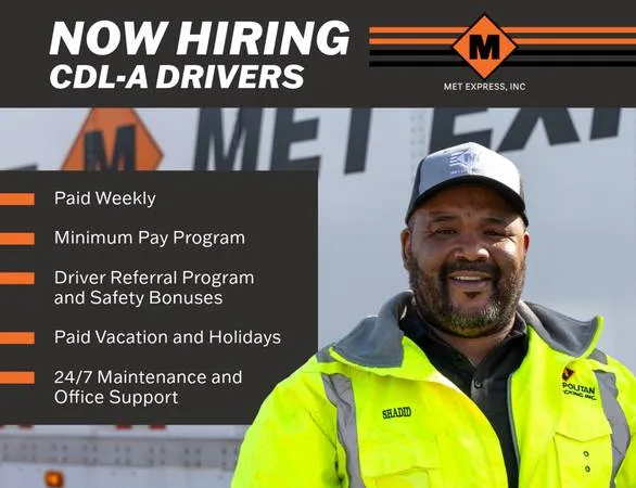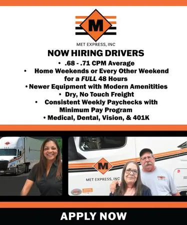 MET Express, Inc. Get home with us weekly on our Regional lane! Here at MET Express, our drivers enjoy driving top-of-the-line equipment with modern amenities while earning an above-average income and consistent home time! With over 90 years in business, we have a lot to offer! Call KIM today @ 570-832-4733 Pay: • Earn .68 - .72 CPM • Weekly pay • Weekly Minimum Pay Program, to ensure consistent paychecks! • Bonus opportunities – Safety & Driver referral bonuses • Per diem program available Benefits: • No touch, DRY fr 8 • Newer equipmentFr 8 liner Cascadia’s, equipped with modern amenities • 24/7 Office & Maintenance Support • Medical, Dental, Vision & 401 K with company match • Pet & Passenger policies • Paid vacation and holidays Home Time: • Regional: Home weekly for a full 48 Hours Requirements: • Valid Class A CDL. • Must be 21 years or older. • No DUI/DWI in the last 5 years. • 3 months of CDL-A Tractor Trailer experience in the last year with an accredited CDL school OR 1 year of CDL-A Tractor Trailer experience within the last 3 years. How to Apply: For fastest consideration, please click here to apply: : Apply Here Call KIM today @ 570-832-4733 MET Express, Inc. Kim St. Clair | Recruiter Direct Line: 570-832-4733 Bloomsburg, PA 17815 *For a full job description, please visit: https://recruiting.metexpress.com/apply