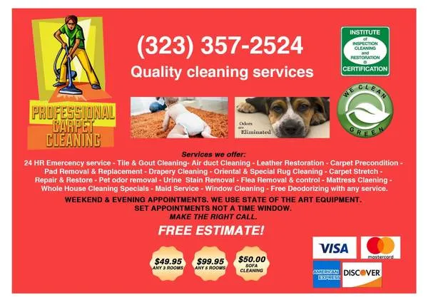 PROFESSIONAL CARPET + UPHOLSTERY + TILE CLEANING SERVICES.323-357-2524. 📞📞📞 323.357.2524 📞📞📞 🔥CARPET CLEANING DEALS🔥 🔥UPHOLSTERY CLEANING DEALS🔥 🔥AIR DUCT CLEANING DEALS🔥 🔥WOOD FLOOR CLEANING DEALS🔥 🔥LVP FLOORING CLEANING DEALS🔥 $49.953/Rooms Carpet Cleaning Deal | Same Day Carpet Cleaner -Same Day Carpet Cleaning -Free Upgrade To Green Eco-Friendly Carpet Cleaning -Powerful Deep Cleaning Truck Mount System -We Also Clean Tile And Grout, Upholstery And Air Ducts, Air Ducts - Whole House $99 Dryer Vent $59 Additional Cleaning Deals: $99 Tile And Grout Cleaning Deal -Heavy Duty Truck Mount Grout And Tile Cleaning -Free Upgrade To Green Pet And Family Safe Cleaning -Same Day Tile And Grout Cleaning Available Upholstery Cleaning Specials -Ask about combining sofas, loveseats or other upholstery for extra savings. $99 Whole House Air Duct Cleaning Deal -Free Upgrade To Green Cleaning -Free Mold Inspection -Free Deodorizer We also offer specialty carpet cleaning services: -Pet odor and urine removal -Emergency water extraction -Spot and stain removal services -Emergency Sewage Cleanup And Sanitizing 📲📲📲📲📞📞📞 CALL TODAY 323-357-2524 3 ROOMS $49.95 /-SAME DAY CARPET CLEAN / 200 sq ft per room ASK ABOUT OUR AIR DUCT CLEANING SPECIALS ** IICRC **CERTIFIED TECHNICIANS ONLY ** CALL NOW 323-357-2524 100 SATISFACTION GUARANTEED. ORGANIC NON-TOXIC SOLUTIONS. STATE OF THE ART EQUIPMENT. SAME DAY SERVICE. $49.95 ...Any 3 rooms. $89.99...Any 5 rooms .. 89.99....Sofa and love seat Call for A free no Obligation estimate 323-357-2524 Service Available. Carpet cleaning. Upholstery cleaning. Tile and grout cleaning. Window cleaning. Maid service. West Hollywood carpet cleaning. . . ******************************************************************************* carpet cleaning/carpet steam cleaning/carpet steaam/carpet shampoo/carpet deep cleaning/carpet zanitizer/carpet deodorizer/carpet resthrech/carpet cleaning van nuys/carpet cleaning los angeles/carpet cleaning san fernando/carpet cleaning long beach/carpet cleaning torrance/carpet cleaning south bay area/carpet cleaning redondo beach/carpet cleaning carson/carpet cleaning gardena/carpet cleaning central LA/carpet cleaning glendale/carpet cleaning pasadena/carpet cleaning burbank/carpet cleaning west hollywood/carpet cleaning hollywood/ carpet cleaning bren 2 od/carpet cleaning santa monica/carpet cleaning culver city/carpet cleaning marina del rey/carpet cleaning el segundo carpet cleaning studio city/upholstery cleaning/upholstery shampoo/upholstery deep cleaning/sofa cleaning/sofa steam cleaning/sofa shampoo/sofa deep cleaning/sofa scotch-guard/sofa cleaning los angeles /sofa cleaning centra lLA/sofa cleaning studio city/sofa cleaning burbank/sofa cleaning glendale/sofa cleaning Carpet cleaning LA, carpet steam cleaning LA, carpet cleaning services LA, best carpet cleaning LA, same day carpet cleaning LA, professional carpet cleaning LA, local carpet cleaning LA, cheap carpet cleaning LA, carpet cleaning deals LA, carpet cleaning company LA, truck mount carpet cleaning LA, deep carpet cleaning LA, steam carpet cleaning LA, Carpet cleaner LA, carpet steam cleaner LA, carpet cleaner services LA, best carpet cleaner LA, same day carpet cleaner LA, professional carpet cleaner LA, local carpet cleaner LA, cheap carpet cleaner LA, carpet cleaner deals LA, carpet cleaner company LA, truck mount carpet cleaner LA, deep carpet cleaner LA, steam carpet cleaner LA, Tile and grout cleaning LA, carpet steam cleaning LA, tile and grout cleaning services LA, best tile and grout cleaning LA, same day tile and grout cleaning LA, professional tile and grout cleaning LA, local tile and grout cleaning LA, cheap tile and grout cleaning LA, tile and grout cleaning deals LA, tile and grout cleaning company LA, truck mount tile and grout cleaning LA, deep tile and grout cleaning LA, steam tile and grout cleaning LA, Grout cleaning LA, carpet steam cleaner LA, grout cleaning services LA, best grout cleaning LA, same day grout cleaning LA, professional grout cleaning LA, local grout cleaning LA, cheap grout cleaning LA, grout cleaning deals LA, grout cleaning company LA, truck mount grout cleaning LA, deep grout cleaning LA, steam grout cleaning LA, Air Duct Cleaning LA, Air Duct steam cleaning LA, Air Duct cleaning services LA, best Air Duct Cleaning LA, same day Air Duct cleaning LA, professional Air Duct Cleaning LA, local Air Duct cleaning LA, cheap Air Duct Cleaning LA, Air Duct cleaning deals LA, Air Duct cleaning company LA, truck mount Air Duct cleaning LA, deep Air Duct cleaning LA, steam Air Duct cleaning LA, Air Duct cleaner LA, Air Duct steam cleaner LA, Air Duct cleaner services LA, best Air Duct cleaner LA, same day Air Duct cleaner LA, professional Air Duct cleaner LA, local Air Duct cleaner LA, cheap Air Duct cleaner LA, Air Duct cleaner deals LA, Air Duct cleaner company LA, truck mount Air Duct cleaner Houston, deep Air Duct cleaner LA, steam Air Duct cleaner LA, Upholstery Cleaning LA, Upholstery steam cleaning LA, Upholstery cleaning services LA, best Upholstery cleaning LA, same day Upholstery cleaning LA, professional Upholstery cleaning LA, local Upholstery cleaning LA, cheap Upholstery cleaning LA, Upholstery cleaning deals LA, Upholstery cleaning company LA, truck mount Upholstery cleaning LA, deep Upholstery cleaning LA, steam Upholstery cleaning LA, Upholstery cleaner LA, Upholstery steam cleaner LA, Upholstery cleaner services LA, best Upholstery cleaner LA, same day Upholstery cleaner LA, professional Upholstery cleaner LA, local Upholstery cleaner LA, cheap Upholstery cleaner LA, Upholstery cleaner deals Houston, Upholstery cleaner company Houston, truck mount Upholstery cleaner LA, deep Upholstery cleaner LA, steam Upholstery cleaner LA, Sofa cleaning LA, Sofa steam cleaning LA, Sofa cleaning services LA, best Sofa cleaning LA, same day Sofa cleaning LA, professional Sofa cleaning 