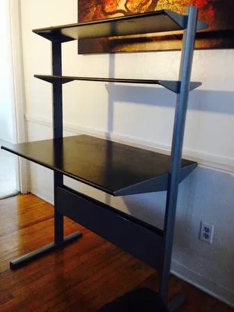 Ikea Fredrik Black Compact Adjustable H 8 Desk for Standing or Sitting Setup in Excellent Condition with Optional Shelf Light Available Ikea Compact 36 Size Fredrik Black Adjustable H 8 Desk which is Configurable for Standing or Sitting which Can Be Set Up from Knee High to a Tall 57 H 8 and Includes 22 Adjustable H 8 Shelves and are in Excellent Condition and selling for Only $160 NOTE: The desk includes 2 adjustable h 8 shelves that can also be set up above or below the desktop at any level. This is the Successor to the Popular Jerker Desk: Configurable for Standing or Sitting Easy Assembly and Easy Transport I will show you how Available Accessories: Desk Lite for Underneath Shelf: $15 with Desk Purchase Keyboard Tray: $25 Mesh Desk Organizer: $20 Leather Desktop Half Round Writing Pad: $35 Fredrik Compact Version: 36 L x 28 W Multipurpose Computer Work Station School or Office Desk / Music or Gaming Station Popular Wood Veneer with Silver Color Powder Coated Frame The table top can be mounted for Sitting or Standing at different h 8 s and different arrangements and can be adjusted and be easily customized to meet your needs! Adjust according to need or your Imagination! Disassembled for easy transport in any vehicle! Call 858-693-6945 to make arrangements
