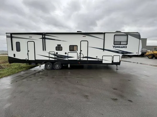 Description - 2019 Vengeance 345 A 13 Forest River Vengeance toy hauler 345 A 13 highlights: 12 Separate Garage Generator Dual Entry Full and Half Bath Loft Outdoor Kitchen Private Bedroom Why vacation in mediocrity when you can take your adventures to the next level with this Vengeance toy hauler from Forest River! With its electric bunk, opposing sofas, loft, and king-size bed, this unit has the ability to sleep 9 people each night, and with a full and half bath also being included, this model will allow every 1 to easily stay clean, as well. G 1 are the days of eating canned beans and stale bread while you camp because the 2 kitchens, 1 indoor and 1 outdoor, will ensure that each meal will be just as delicious as those prepared at home. All of these indulgent amenities and the exceptional price tag are what contribute to making this unit a part of A New Breed of Toy Hauler. Whether you enjoy kayaking down the river, riding your ATV into the deep forest, or fishing for that next big catch, this toy hauler will allow you to bring along all of your favorite toys without feeling overwhelmed because of its separate garage space, and the fuel station with pump that has been included will make sure that your fun and your gas will last the entire weekend. When it comes time to clean up from the afternoons adventures, you will appreciate the outdoor shower with hot and cold water that will allow you to rinse off before you go inside so that you dont track nature everywhere. Call or Text Brandon at 161-695-3997 or Mike 1-231-670-9025 NO DEALER PREP FEES, AND NO SURPRISE DEALER FEES We take all trades, Autos, RVs, Boats, Side-by-Sides etc., we take everything. We offer shipping to your door! ★★★Let us show you the 𝐁𝐋𝐔𝐄 𝐒𝐓𝐀𝐑 𝐃𝐈𝐅𝐅𝐄𝐑𝐄𝐍𝐂𝐄 ★★★ Best Prices – No Hidden Fees Vengeance 345 A 13 RVs are manufactured by Forest River. 2019 Vengeance 345 A 13 Specifications Sleeps 7 Hitch W 82398 lbs. Ship W 811939 lbs. Gross W 8 GVWR 16000 lbs. LengthExterior 396 H 8 Exterior 133 WidthExterior 85 Slides 2 Fresh Water Capacity 100 gallons Gray Water Capacity 50 gallons Black Water Capacity 50 gallons Bathrooms 2 We aim for accuracy and transparency in our online information. While we do our best to provide precise descriptions, pricing, and RV specifications, occasional errors may occur. Please contact us for verification and specific details.