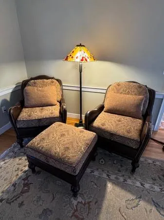 2 Century Furniture Chairs with Ottoman Call or text Brent with questions or pick-up 617-378-2730 Lamp not included.
