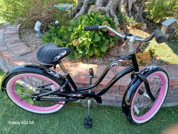 20 Electra Little Betty Girls Beach Cruiser Bike. Color is Black with Flames, 20 Pink Alloy Wheels with Whitewall Tires. Quick Release Gel Seat. This Bike Looks and Rides Like New. Call Ed cell 714-356-7769 or 7148405157
