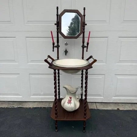 Vintage washstand with water pitcher and bowl. Measures 21 wide x 17 deep x 52 tall. Call or text 614-424-0926.