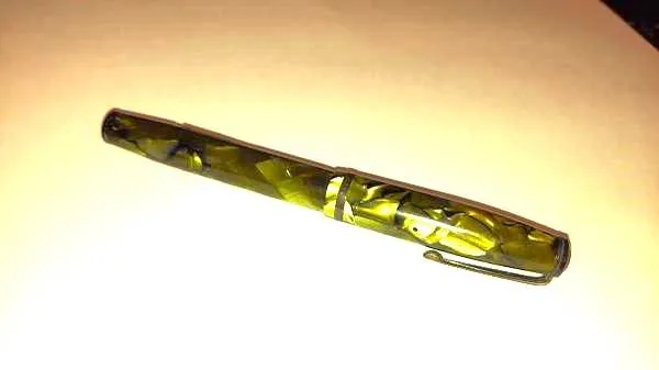 selling as is. no damage to pen but may need cleaning and restoration, Original gold-colored Special Alloy nib green pearl celluloid cap and barrel, Call 937-972-1595 ddl