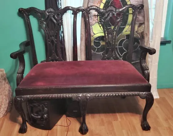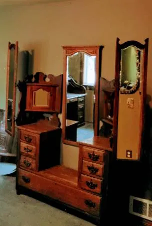Antique carved wood dresser with beveled mirrors. Available. Measures H-72. W-67 D-16. 541-650-5751