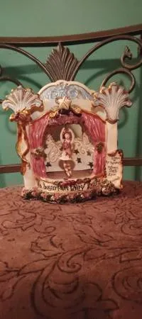 Sugar plum fairy decor turn the blue star music plays and ballerina spins can hold a voltage candle in back. 9 x 10 available 541-650-5751