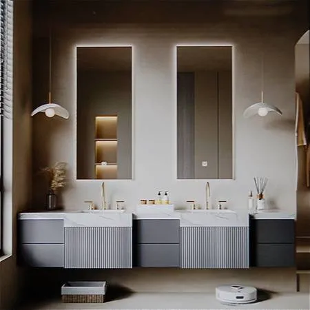 NEW, NEVER INSTALLED. 100 IN. DOUBLE SINK FLOATING VANITY WITH ANTI FOG, LED MIRRORS. JUST PAID OVER $3,300.00 FOR IT. THE FLOOR PLAN CHANGED IN OUR NEW BATHROOM, AND IT WILL NOT FIT. BRUSHED NICKEL PULLS, *FAUCETS NOT INCLUDED. WAS 950.00 CASH NOW $650.00 CASH!!!!! PLEASE CALL ROBERT AT FOR MORE DETAILS. THANKS FOR LOOKING!