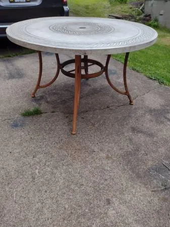 Faux concrete patio table with metal base for sale. Heavy duty construction. Measures 48 across and 29 high. Delivery is available. Call Mike Penn Hills 412-526-8360. If you reply by email and do not see my response, please check your spam folder.