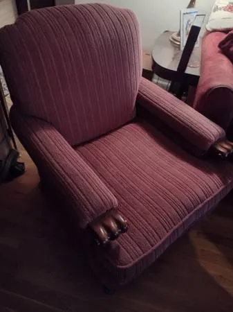Vintage Shearman upholstered arm chair for sale. Salmon colored original fabric. Made in Jamestown N.Y. Hardwood hands on the front of the arms. Delivery is available. Call Mike Penn Hills 412-526-8360