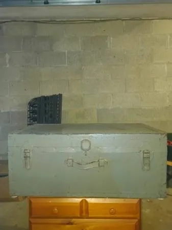 Hi this is a vintage trunk my mom thinks its from the early 7 ties cuz it was my uncles and from the toys she said that were in there my gram said it was from when they moved in 1974 so its at least that old. But she thinks they got it from a garage sale before they moved because they didnt have luggage so Im not good with finding age but its a cool piece the color is neat and it has these old decals on it. If interested 412-660-9579 thank you