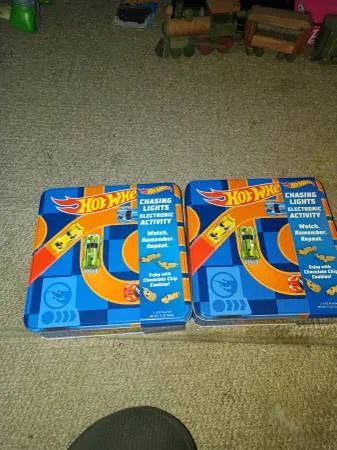 Hi and Im selling my brand new Hot Wheels tins that came out around Christmas this year and they have an electronic game on them which is pretty cool and theyre both brand new sealed and inside the tin are cookies and I believe a pamphlet of some sort Im not sure Ive never opened 1. Asking $25 a piece or if you get both Ill do $40. Ive seen recently 1 sell for 35 bucks with free shipping for 1 and I saw another 1 sell for $29 with $3 shipping. 412-660-9579 if interested. Thank you