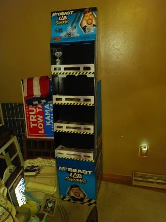 I have a display stand for the Mr. beast lab Swarms and it comes with the stand up and the display and 2 promotional figures in the display as well as a prototype tube and this is brand new also the couple figures that are on the display and also the tube on the display that shows what they are are rare but you can see in the pictures what I mean if youre interested let me know 412-660-9579. Thank you. NES Nintendo super Nintendo toys video game