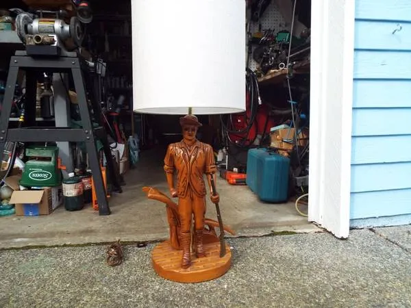 carved figure stands 19 tall , Lamp total h 8 is 35 with 11 inch wood base , bronze rifle, Has 3 way light switch, shade measures 14 inches dia. and 13 tall. No text will be answered at this number and I will not call you from a text so either email thru Craigslist or I would rather if you are serious that you call Bill at 971-704-9136 Oregon phone number but we are local