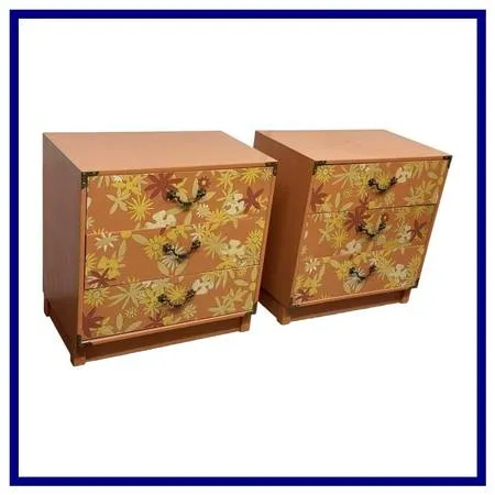 Vintage Drexel Whimsy Campaign Bedside Cabinets, A Pair. Vintage Drexel Whimsy Campaign Bedside Cabinets, a Pair Design Plus Gallery presents a Pair of Whimsy 3 Bedside Cabinets by Drexel. The Pair work together as a 6 drawer dresser, or apart as nightstands with great storage. A warm retro orange and gold color palette is flower power, detailed with brass daisy handles. Visible surface wear; as shown; condition is fair for age and use. Dimension: Dimension: 30 X 18 X 30 In SKU: 9442-001 SKU: 9442-001 www.DesignPlusGallery.com Please Call 415-455-816-5733 Francisco Blvd East San Rafael, CA 94901 Our San Rafael Showroom is 5,000 Square Foot, filled with High End Merchandise for a fraction of the price. We are open 7 Days/Week. Mon - Sat 10 am - 6 pm Sun 11 am - 5 pm We have a second Location in San Francisco 6,000 Square Foot: 3338 th Streetat Folsom StSan Francisco, CA 94103415-800-8030 Design Plus Consignment Gallery offers an Amazing Selection of Furniture and Home Decor from All Styles at Affordable Prices. We receive new shipments on a daily basis. If you are interested in this item, please send us an email with your questions and your information including phone number for faster response. We will be happy to answer all your questions, provide more images or schedule viewing of the item in our showrooms. Thank you