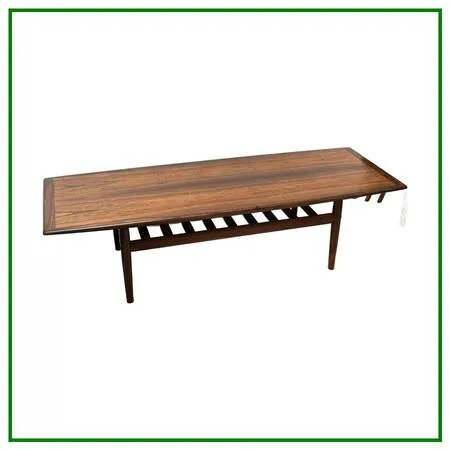 Vintage Mid Century Rosewood Coffee Table. Vintage Mid Century Rosewood Coffee Table Design Plus Gallery presents a Vintage Mid Century Rosewood Coffee Table. Classic wide plank rosewood, with the slightest bow, creates this stunning surface as a centerpiece to your room. The base has a slatted shelf and tapered legs. Stunning. Light surface wear; condition is consistent with age and use. Dimension: Dimension: 63 X 23.5 X 17 In SKU: 9438-005 SKU: 9438-005 www.DesignPlusGallery.com Please Call 415-455-816-5733 Francisco Blvd East San Rafael, CA 94901 Our San Rafael Showroom is 5,000 Square Foot, filled with High End Merchandise for a fraction of the price. We are open 7 Days/Week. Mon - Sat 10 am - 6 pm Sun 11 am - 5 pm We have a second Location in San Francisco 6,000 Square Foot: 3338 th Streetat Folsom StSan Francisco, CA 94103415-800-8030 Design Plus Consignment Gallery offers an Amazing Selection of Furniture and Home Decor from All Styles at Affordable Prices. We receive new shipments on a daily basis. If you are interested in this item, please send us an email with your questions and your information including phone number for faster response. We will be happy to answer all your questions, provide more images or schedule viewing of the item in our showrooms. Thank you
