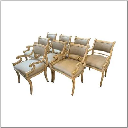 Custom Design Leather + Embroidered Silk Neoclassical Arm Chairs, Set Of 8. Custom Design Leather + Embroidered Silk Neoclassical Arm Chairs, Set of 8 Design Plus Gallery presents a Set of 8 Custom Neoclassical Dining Chairs. Distinctive silhouette and expert craftsmanship, the set of dining chairs are intentionally aged with a distressed patina and the subtlest touch of gilt. The deeply cushi 1 d back and seats are upholstered in a neutral tightly woven leather and trimmed in complementary cable trim. The backs are works of art, with silk panels festo 1 d with delicate floral embroidery and a touch of color. Reupholstered 8 years ago. Light surface wear; condition is good for age and use. Additional Measurements: Arm H 826 inches Seat H 821 inches Dimension: Dimension: 24 X 24 X 35 In SKU: 9235-003 SKU: 9235-003 www.DesignPlusGallery.com Please Call 415-455-816-5733 Francisco Blvd East San Rafael, CA 94901 Our San Rafael Showroom is 5,000 Square Foot, filled with High End Merchandise for a fraction of the price. We are open 7 Days/Week. Mon - Sat 10 am - 6 pm Sun 11 am - 5 pm We have a second Location in San Francisco 6,000 Square Foot: 3338 th Streetat Folsom StSan Francisco, CA 94103415-800-8030 Design Plus Consignment Gallery offers an Amazing Selection of Furniture and Home Decor from All Styles at Affordable Prices. We receive new shipments on a daily basis. If you are interested in this item, please send us an email with your questions and your information including phone number for faster response. We will be happy to answer all your questions, provide more images or schedule viewing of the item in our showrooms. Thank you