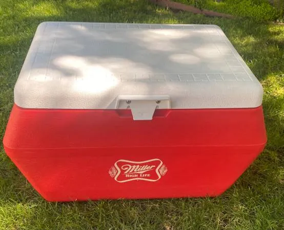 LIKE NEW VINTAGE GOTT RED MILLER HIGH LIFE ICE CHEST COOLER 50 QUART MODEL 1950 ALL ORIGINAL INCLUDING FOOD TRAY AND WATER JUGS WITH BUILT IN HANDLES AND DRAIN PLUG IN AMAZING ORIGINAL CONDITION IN GOOD WORKING CONDITION MUST SEE SEE ALL THE PICTURES CONTACT TOM AT 141-526-0117