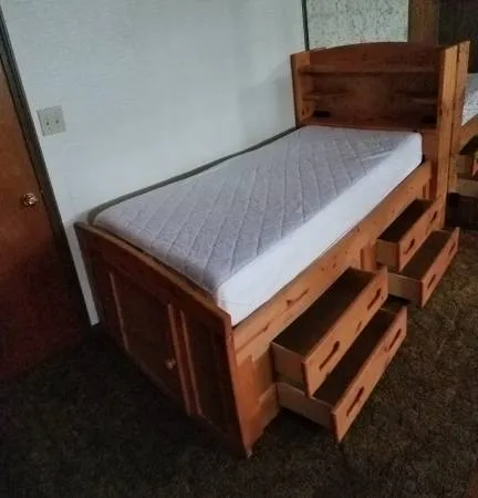 Captains Bed ● Bed total: 86 x 45.5 ● Mattress: 73 x 38 x 8 ● Tempur-Pedic Cloud Twin ● Drawers and other storage under bed ● Headboard with shelves ● Extra Bed ● Slept in less than a handful of times ● Very clean, like new ● Downsizing This bed is in a clean, non-smoking, no pet home. $500 obo If you are interested and/or have any questions, text me at: 406-560-6635