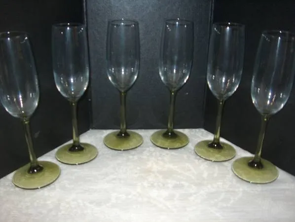 I HAVE SERVERAL WINE/CHAMPAGNE FLUTES.8 OZ. CLEAR GLASS WITH LITE GREEN STEMS. 91/4 TALL ALL IN VERY GOOD CONDITION, SOME HAVE NEVER BEEN USED AND STILL HAVE TAGS. USA. MADE. 5.00 EACH. . JUST LET ME KNOW HOW MANY YOU WOULD LIKE. NABB IS 25 MILES NORTH OF LOUISVILLE JUST NORTH OF CHARLESTOWN. phone OR TEXT JANE. 502-291-0825