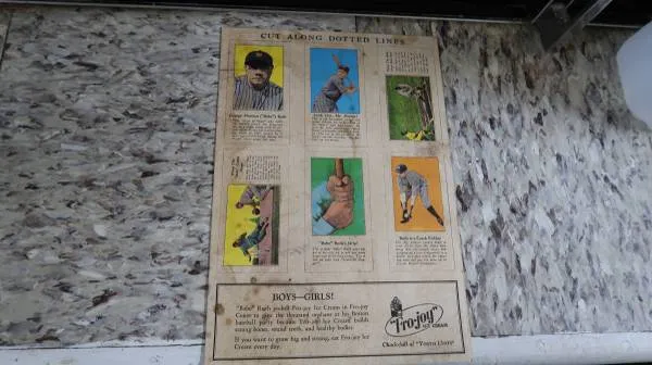 THIS IS AN ICE CREAM ADVERTISEMENT FRO-JOY ICE CREAM WHICH IS A CUT ALONG DOTTED LINES OF BABE RUTH CARDS, THERE ARE 6 CARDS TOTAL. THE BACK IS STAINED THE FRONT IS GOOD. I FOUND THIS IN AN ESTATE SALE. ASKING $100.00 OR BEST OFFER OR TRADE. CALL OR TEXT 502-291-0825, I LIVE IN NABB INDIANA WHICH IS JUST RIGHT OUTSIDE OF CHARLESTOWN INDIANA AND ONLY 25 MILES NORTH OF LOUISVILLE EASY TO FIND.