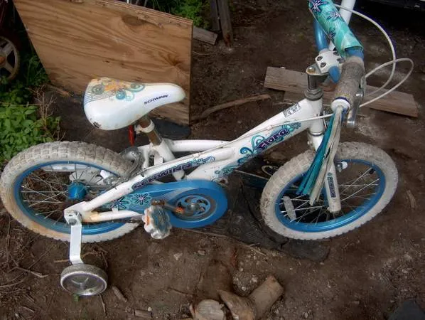THIS IS A SCHWINN FLORA KIDS BICYCLE WITH TRAINING WHEELS. NEEDS A LITTLE TLC.DIRTY,I IT LOOKS LIKE IT MADE NEEDS PEDDLE, MAYBE.SEAT HAS A CRACK IN IT. CUTE LITTLE BIC. MAY DO SOME TRADING? THANKS. JANE. 502-291-0825. phone OR TEXT. NABB IS 25 MILES NORTH OF LOUISVILLE. JUST A LITTLE NORTH OF CHARLESTOWN