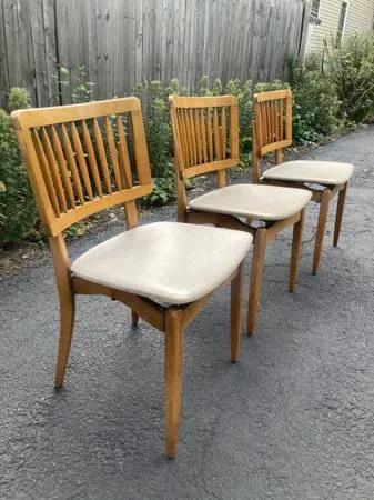 Unique Mid Century Modern Folding chairs by Stakmore. They are in good conditions for their age, 1 shows a small damage on the vinyl seat cover shown in picture. Delivery available to all Chicago area and surrounding.. Message at 331-205-0962 for any questions, no checks are accepted. Back rest 31 tall Seat h 818 Seat 163/4 x 16