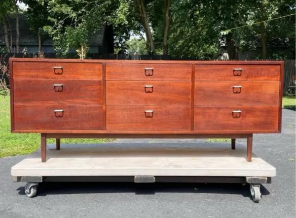 Available Mid Century Modern 9 Drawer Dresser/Credenza/Media Center. This piece shows minimal amount of imperfections from age and from being pre-own we highlighted the blemishes that stand out the most, some darker rings that blend with the finish and the back right edge. Please see all pictures and ask any questions you may have about this piece. Delivery is available to all Chicago land and suburbs.message at 331-205-0962 for any questions. Width 771/2 Depth 18 H 830