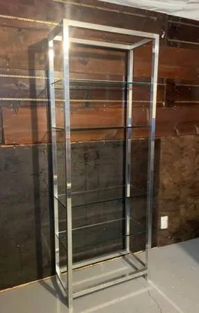 Available Vintage Mid Century Modern Aluminum Chrome Frame Etagere Display Shelf. This piece shows minimal amount of imperfections from age and from being pre-own please see all pictures and ask any questions you may have about this piece. Delivery is available to all Chicago land and suburbs. Message at 331-205-0962 for any questions. Frame depth 14 Frame width 30 Frame h 880 Flame thickness 11/4 Glass depth 111/4 Glass width 293/4 Floor to first shelf h 8171/2...