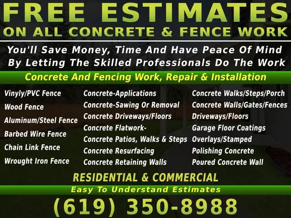 Need Expert Fencing, Concrete, or Lawn Care Services? Call - 619-350-8988 We provide top-notch solutions for your outdoor needs. Whether you’re planning to upgrade your driveway, secure your property with a sturdy fence, or maintain a lush lawn, we’ve got you covered. Our experienced team takes pride in delivering quality results that exceed expectations. Why Choose Us? - Skilled professionals with years of expertise - On-time project completion - Attention to detail in every project - High-quality materials used for lasting results - Personalized services tailored to your needs Concrete Stamp Pavers Polishing Concrete Sawing Or Removal Slab Staining Repair Stamped Install Resurfacing Patio Quotes Driveways Decorative Concrete Curbing Patios Walks & Steps Retaining Walls Countertops Quality Pouring Foundation Cutting Services Pool Decking Fla 2 rk Repair Finisher Service Floor Block Fla 2 rk Removal Pouring Foundation Fencing Wood Fences Vinyl Chain Link Fence Repair Aluminum Steel Barbed Wire Wrought Iron Deck Decks Wood Decks Stained Wood Patios Gazebos Pergolas Barn Fence Picket Fences Fence Installation Privacy Fence Backyard Fence Contractors Outdoor Fences Proudly referring contractors since 2005
