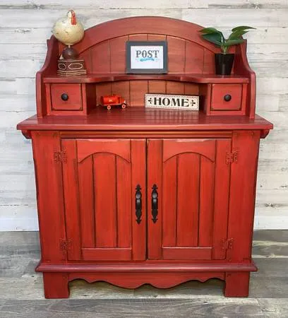 Rustic barn red cabinet. Solid wood and very sturdy. All 1 piece. Drawers are dovetailed. Dark waxing for a distressed farmhouse style. Width - 42 Depth - 19 H 8 - 53 H 8 in between top shelves - 6 $355 located in Canby. No holds. Purchase directly through our website and view our inventory. Www.postfurnishings.com Text 541-490-6212 Entryway, farm life, chicken, hutch, storage, kitchen, bar,